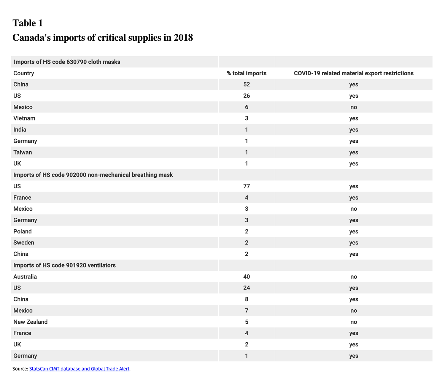 Critically for Canada, this list of countries includes almost all those from which Canada imports critical supplies as seen in table 1, below. All these countries except Mexico, Australia and New Zealand at some point during the crisis have had assorted forms of export restrictions on COVID-19 related materials.