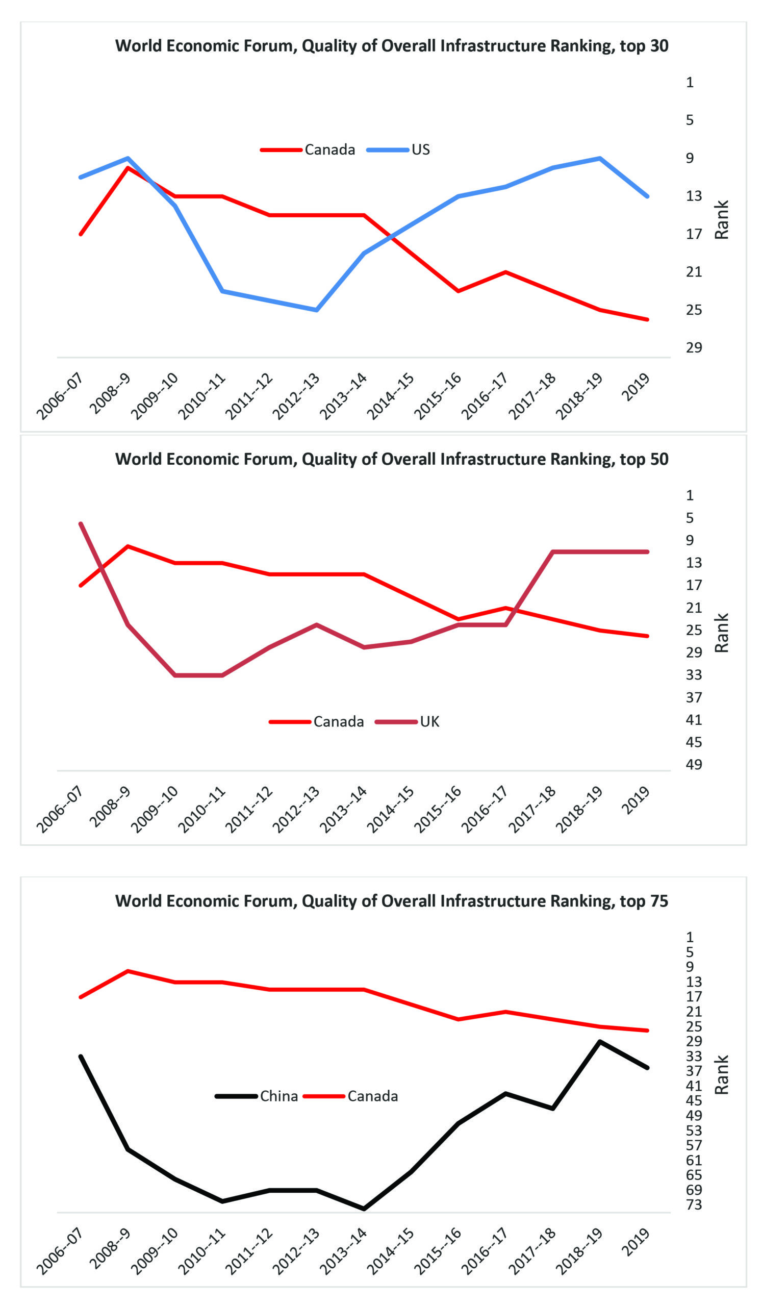 World Bank and World Economic Forum, been consistently falling. The country’s infrastructure ranking has fallen steadily from 10th best in 2008-09 to 26th today. More disturbing, when the specific category of transportation infrastructure is pulled out Canada ranks 32nd.