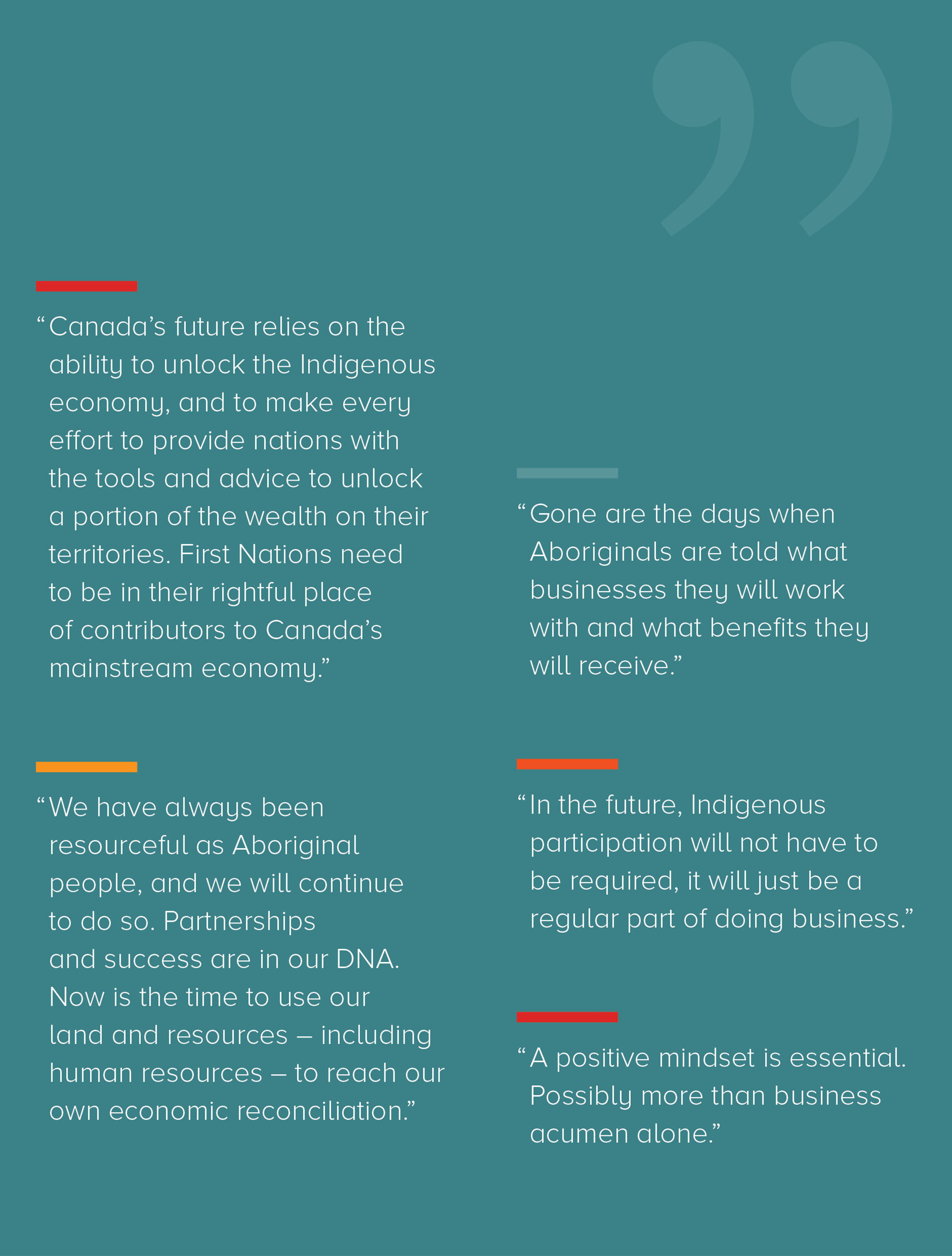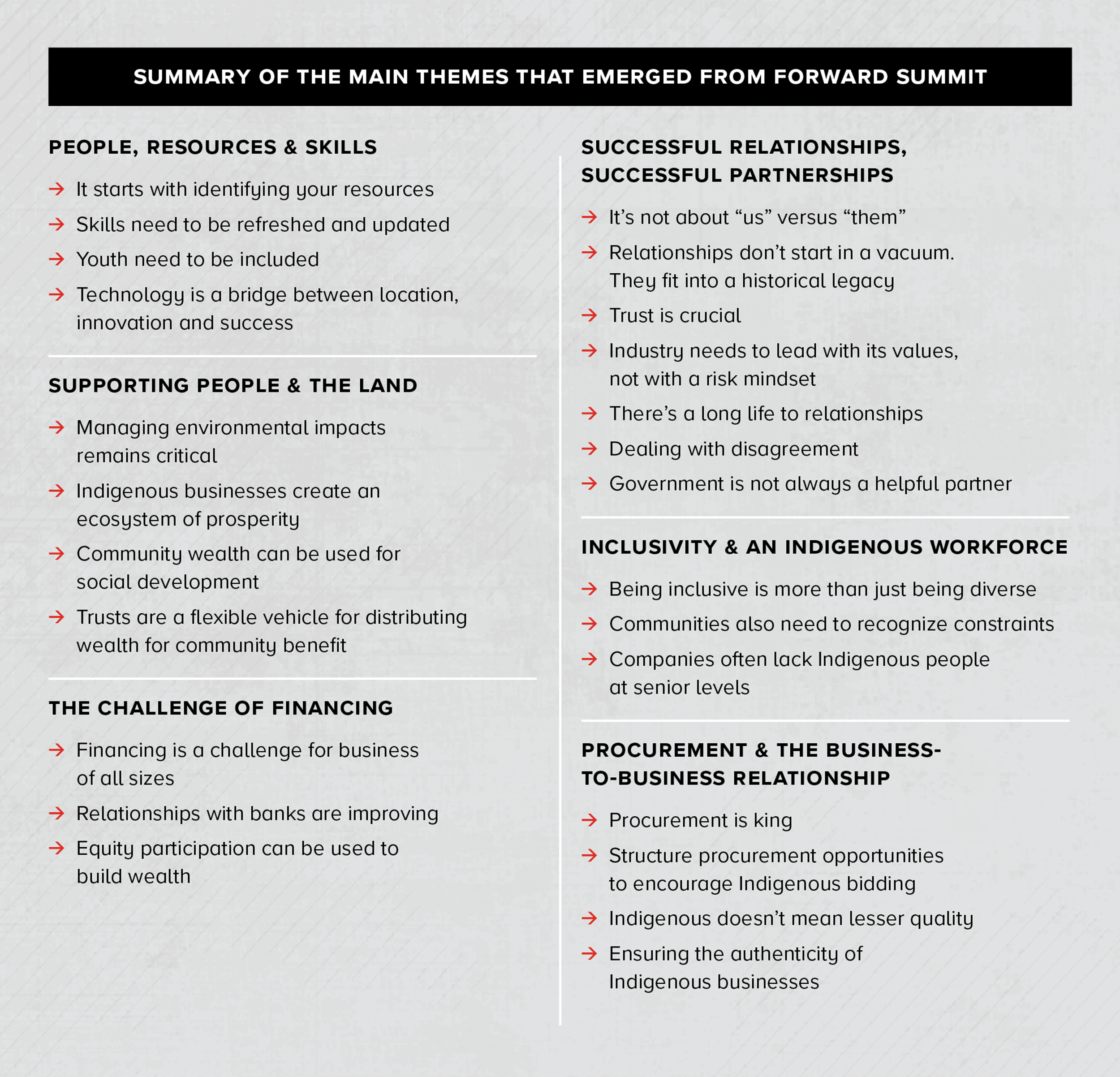 The report is not intended to be a comprehensive study of economic participation and reconciliation in Canada. Rather, it adheres to the stories and learnings that were shared at the event. Wherever possible, quotes have been included (without naming the speaker) to showcase the powerful wording that was used. The box on page 04 shows the main themes that emerged at Forward Summit; the first part of this report explores them in more detail.