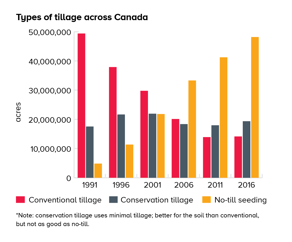 While Canada is certainly not the only country that practices zero tillage farming, it is more widespread here than for many of our competitors. In 2017, the United States farmed 21 per cent of its cropland continuously as zero tillage,11 whereas in Canada in 2016 it was over half.