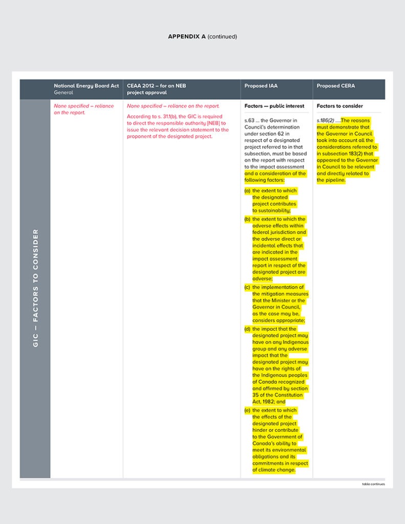 • The language set out for decision-making by the GIC in the IA Act should not be expanded this way, but revert back to what has been opined on and approved by the courts. See Appendix A for a comparison of the language of today (NEB Act and CEAA 2012) versus what is proposed in Section 65(2) of the IA Act for GIC decision-making.