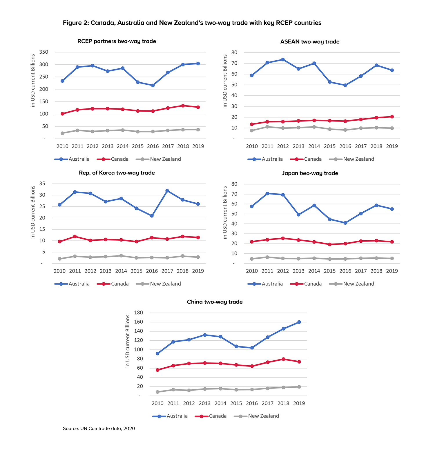 Comparing two-way trade flows, Canada does not trade nearly as much as Australia with China, ASEAN and the RCEP partners (Figure 2). This is reasonable as Australia is geographically closer and much more reliant on trade with the region. However, by being late to the table, Canada will lack the supply chain integration that Australia and New Zealand will have with ASEAN, China and the regional bloc.