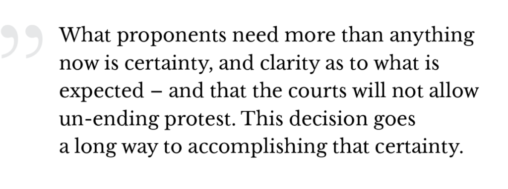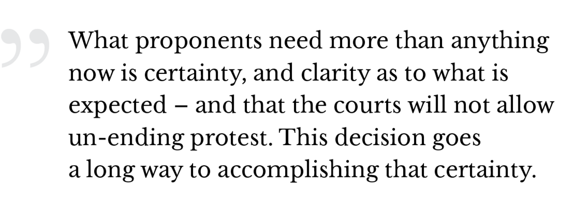Finally, from a project proponent’s perspective, the court’s commentary on both the NEB and duty to consult should give confidence, rather than cause the current hue and cry. Why? Because the goalposts are now much clearer. The likelihood of more lengthy court delays is now diminished because the court was so specific with its judgement and its recommendations. Subsequent courts will be bound by this decision, and if the parameters set out here are met by the various stakeholders, projects will be able to proceed. Those worried about never-ending protests, environmental activist groups and Indigenous communities now have much less to complain of. Indeed, much of the commentary post-decision has been just that: “Finally, we’ve been heard!!” But for them as well, the court has clarified the parameters of engagement in order to move projects forward. They cannot simply say “no” anymore. Most investors in major infrastructure or related projects are not afraid of firm environmental regulations or of engaging in successful partnerships with Indigenous communities. Indeed, in this case the proponent, Kinder Morgan, engaged extensively with Indigenous communities – the fault lay with the federal government. What proponents need more than anything now is certainty, and clarity as to what is expected – and that the courts will not allow un-ending protest to stymie projects. This decision goes a long way to accomplishing that certainty.