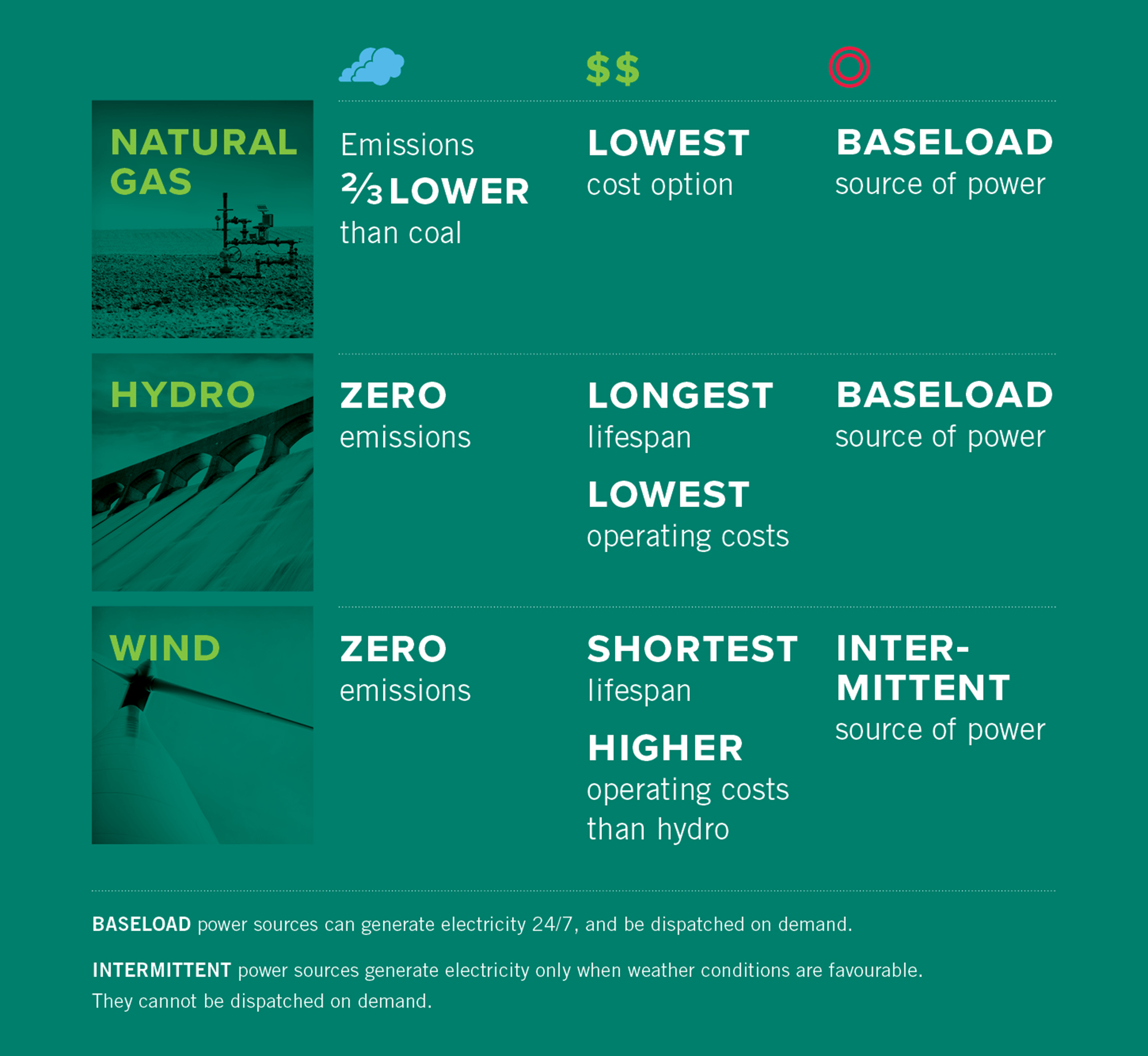 This analysis reveals that hydro is the lowest cost non-emitting generation option. While hydro has high upfront capital costs and is more expensive to build than natural gas, it has the longest lifespan and the lowest operating costs of all power generation options. Another advantage is that hydro produces reliable baseload electricity, making it a natural substitute for coal-fired generation. If the goal is to replace coal-fired generation with low-cost and reliable substitutes that reduce emissions, then hydro deserves consideration.
